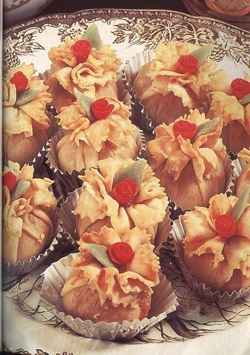 ثم ناخد العجينة و نفردها و نرش من تحتها الطحين و نفردها 2 مم تقريبا و نقطعها دوائر صغيرة و بعدها ناخذ بياض بيضة و نطليه فوق الدوائر و نضع داخلها الحشو في الوسط و نغلقها قليلا من تحت من الجهة الرفيعة و نزينها بالقبضة الخاصة بالحلوى نسخن الفرن ثم نضع فيه الحلوى تنضج على درجة 200 و مدة 20 الى 25 دقيقة
