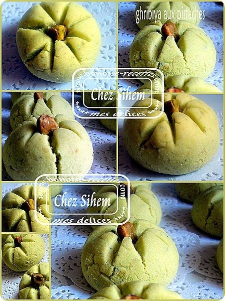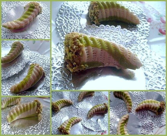 في إناء نخلط اللوز مع السكر ، الفانيليا والبيض والقليل من الملون الفستقي
