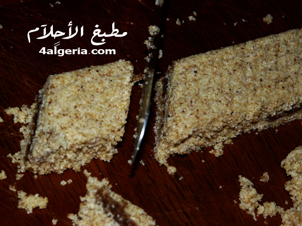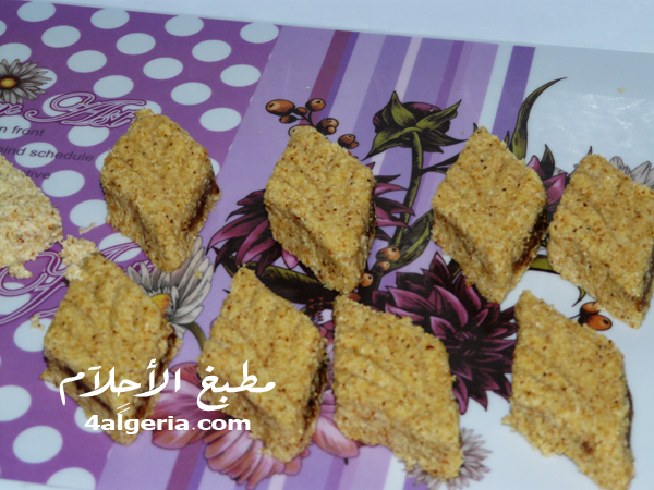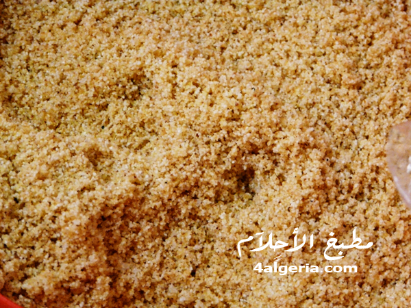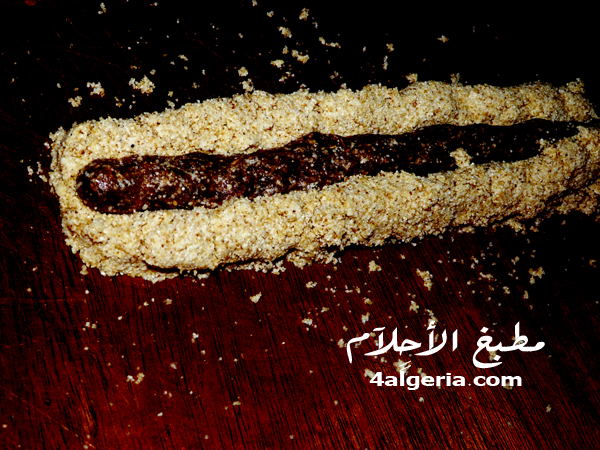 من بعد تاخدي كمية طرحيها فوق المائدة وجمعيها بالماء و ماء الزهر شكلي بيها حربوش وفتحي في الوسط ثم شكلي حربوش رقيق للتمر وضعيه في الوسط واغلقي عليه من الجوانب