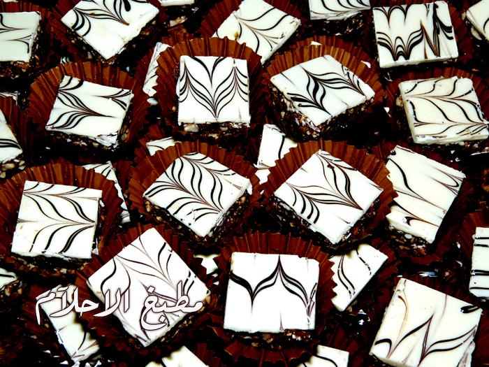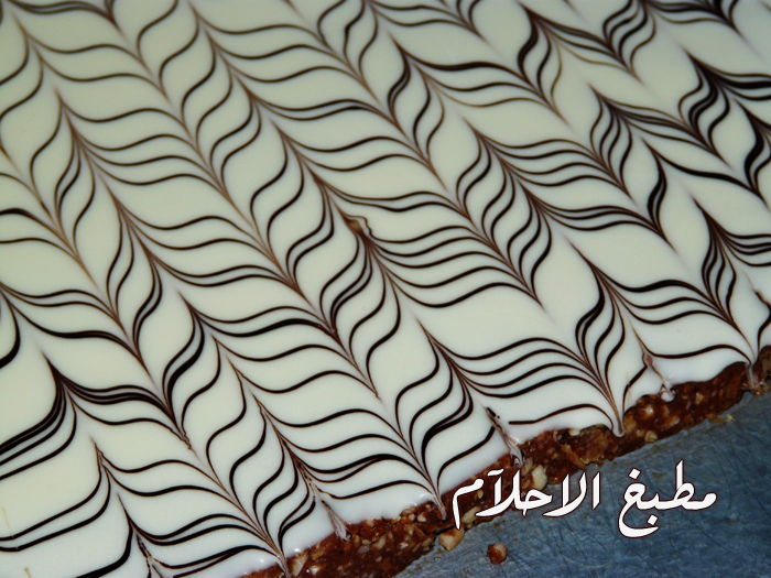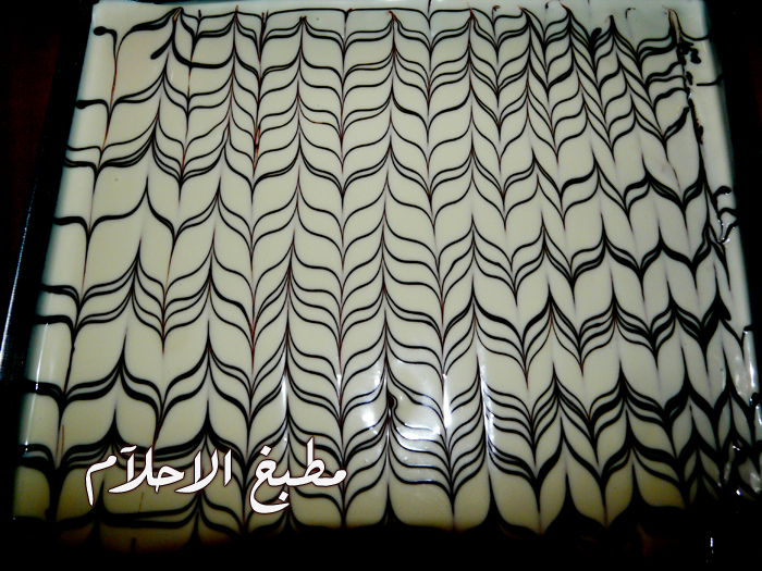 وعلى حمام مائي نذوب شوكولا استعملت نوعية الوجدان علبة كاملة وفي نفس الوقت ندوب قليل من الشوكولا السوداء ونسكل خطوط من بعد مانبسط الشوكولا البيضاء