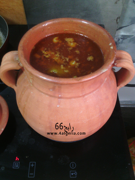 بعد ساعة نشلل لفريك ونحطو في المرق وسط البرمة ونبقى مرة مرة ونحركها باش مايشبطش لفريك في قاع البرمة