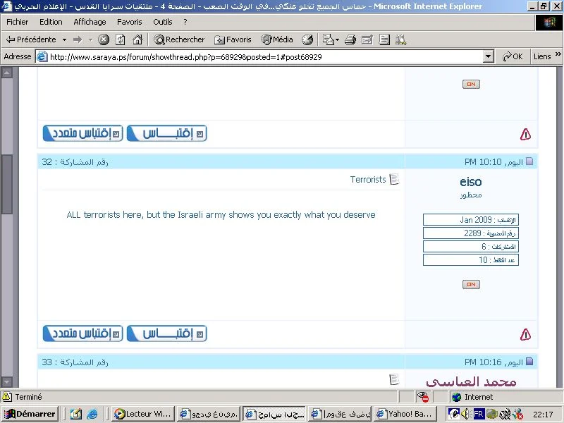 واش من ارهاب راه يهدر عليه المدنيين اللي راهي تقصف فيهم اسرائيل ولا الاطفـــال والنساء اللي راحو ضحايا ربي يرحمهم هذا الارهاب اللي راه يستهدفوا الجيش الاسرائسلي ربي يهدو !! راهم يخدعوا فينا ولا في روحهم