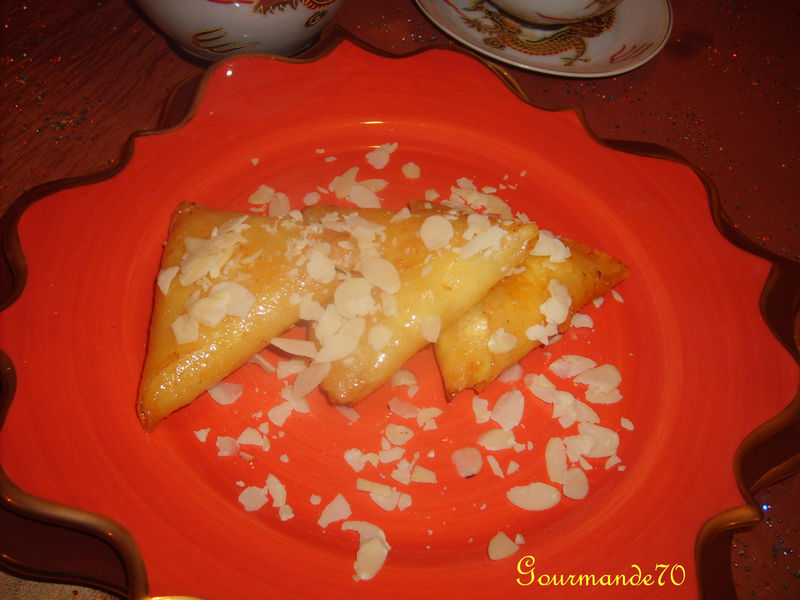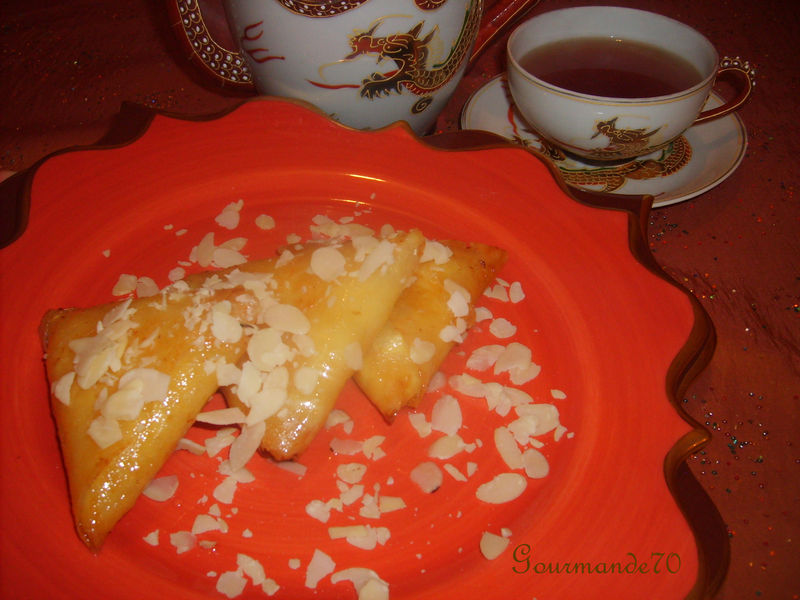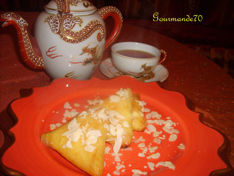 Mettez frir dans l'huile chaude et trempez-les dans du miel ,décorez avec les amandes éffilées.