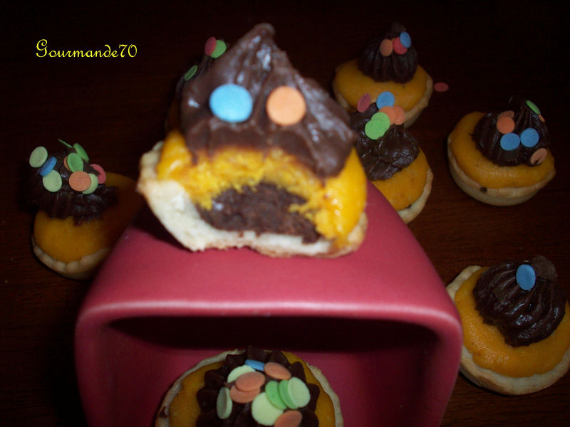 Faites fondre le reste du chocolat avec de la crème fraiche,laissez refroidir un peu,et avec une poche à douille décorez le dessus des mini bouchées et parsemez de confettits multicolores.