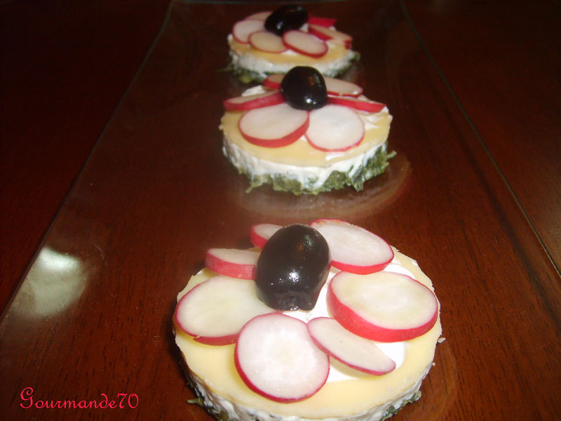 Faites passer les épinards bien lavés , essorés et coupés dans un peu de beure puis mélangez avec les oeufs ,la moutarde et le sel,verzez sur une plaque et mettez au four,une fois prét coupez des ronds à l'aide d'un emporte pièce mettez dessus du fromage frais ,ensuite les tranches de fromage coupées avec le meme emporte piéce mettez dessus une c à c de fromage blanc pour y déposer les rondelles de radis et décorez avec les olives noirs.