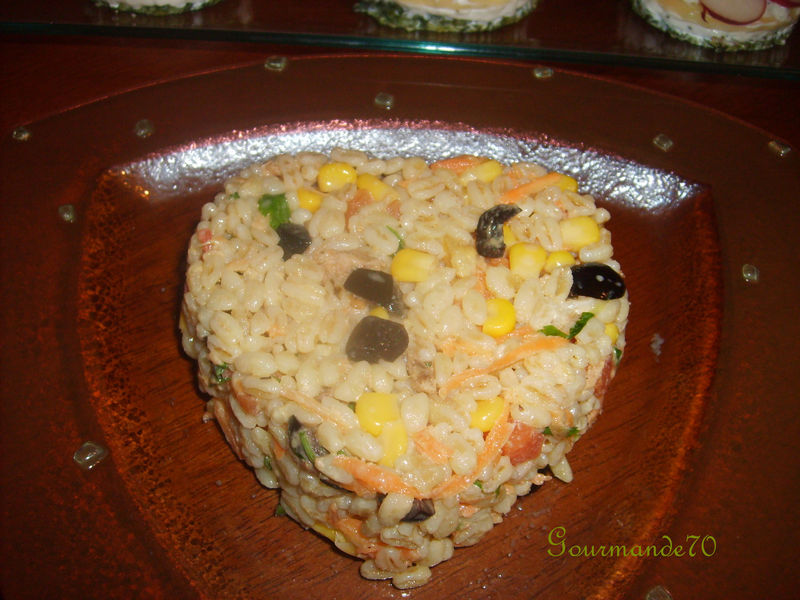 Faites bouillir le blé dur dans l'eau salée,égouttez et rapez dessus les 2 carottes , coupez la tomate épepiné en petit dés , ajoutez le mais , les olives noirs coupées le thon,les feuilles du persil ,mayonaise, moutarde et sel.