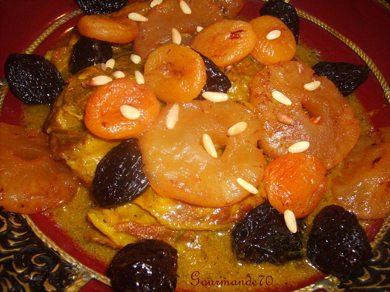 Dans une marmite mettez les morceaux de viande, ajoutez l'oignon coupé,le persil,les épices,et l'huile ,laissez macérer le maximum,puis mettez la marmite sur le feu ,pendant ce temps prenez une casserole ou vous mettez l'ananas,les abricots , les prunes dans un peu d'eau et le sucre,canelle et 1/2 verre de fleur d'oranger,laissez cuire 10 mn .