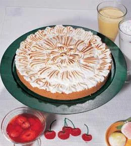 - يُوزّع الميرانغ بشكل متجانس على الفطيرة وتُخبز الفطيرة لمدّة 15 دقيقة في فرن مسخّن على حرارة 200 درجة مئويّة حتّى يصبح لون الأجزاء الناتئة ذهبياً.