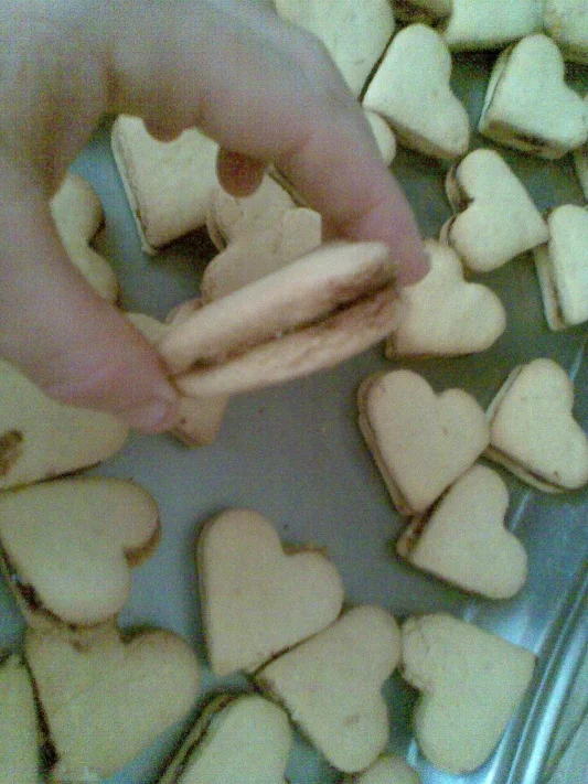 المقادير : 500 غ زيت +كاس سكر ناعم +فاني +كاس كاوكاو مطحون+2بيض+2صفار+75 غ حلوة الترك+1 خمارة+فرينة قد ما تتلم+ترتاح 20 د في الثلاجةطريقة التحضير : حليها بسمك 5 مم واطبيعيها على شكل قلب وادخليهافي الكوشة 160 درجة تصفار فقط ثم الصقيها 2 با لشيكولة وضعي الطليةو زوقي بالشيكولة زيكزاك وضعي ملمع الحلويات البريون وورود حمراء