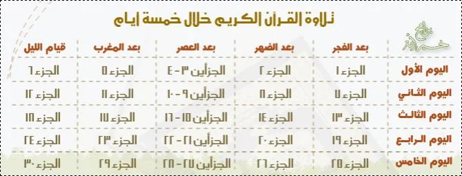 السلام عليكم ورحمة الله تعالى وبركاته اما بعد اقدم لكم برنامج لختم القران في 5 ايام- 10 ايام او15 يوم وارجو ان ينال اعجابكم