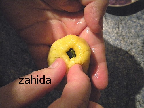 [FONT=tahoma,arial,helvetica,sans-serif]mettez la boule de farce de votre choix(pistaches,noix…) à l'intérieur et soudez avec les doigts afin de l'enrober entièrement.[/FONT]