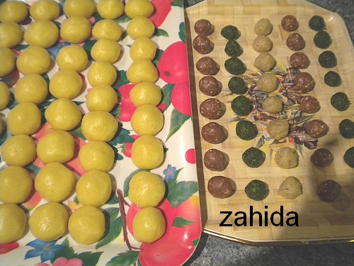 [FONT=tahoma,arial,helvetica,sans-serif]Faites des boules avec la pâte préparée de la grosseur de votre moule:grandes,moyennes,petites[/FONT]