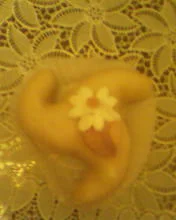 بعد ما ترتاح العجينة نحلها على سطح مرشوش بالفرينة و نشكل دوائر و نحط فوق كل دائرة حشو على شكل حرف T نسكر العجينة مليح حتى لا يتسرب الحشو و نقلبها على الجهة الاخرى و ندير القرون الثلاثة في اتجاه واحد للحصول على شكل ترافل نطهيها في الفرن لما تبرد نقلسيها بالطلاء لما تنشف ناخذ قطعة اسفنج نمسح السطح باللماع و نضع فوقها وردة عجينة اللوز بيضاء لقطعتها بواسطة طابع الوردة وفوقها دائرة من عجينة اللوز بيضاء مع ورقة في الجانب
