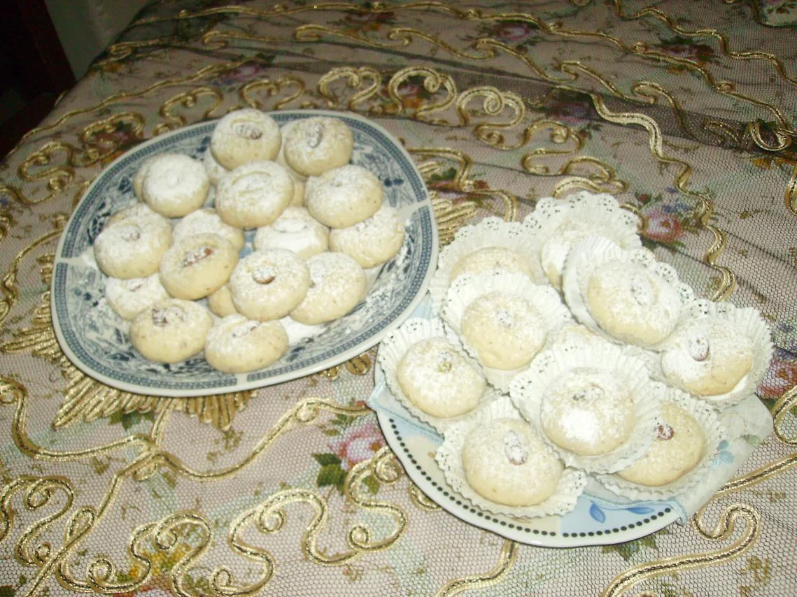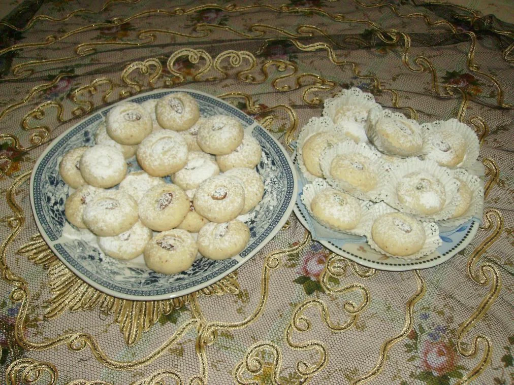 طريقة التحضير:يمزج السكر الناعم مع الزبدة حتى يصبح الخليط ابيضاثم نضيف الجلجلان المحمص ونمزج مرة ثانيةثم نضيف الجوز الهندي و الفرينة المغربلة شيئا فشيئا حتى نتحصل على عجينة متماسكة و لكن لا يجب ان تكون يابسة.في الاخيرنضيف اللوز المرحي خشن او الكاوكاونمزج جيدا.جزئي العجينة على شكل كريات صغيرة تبسط قليلاوترتب في صيثية وتزينبحبات الوز او الكاوكاو المحمصة.تخبز في فرن هادئ.بعد ذلك بواسطة مصفاة رشي فوقها السكر الرطب. بالهناء و الشفاء.والسلام عليكم.