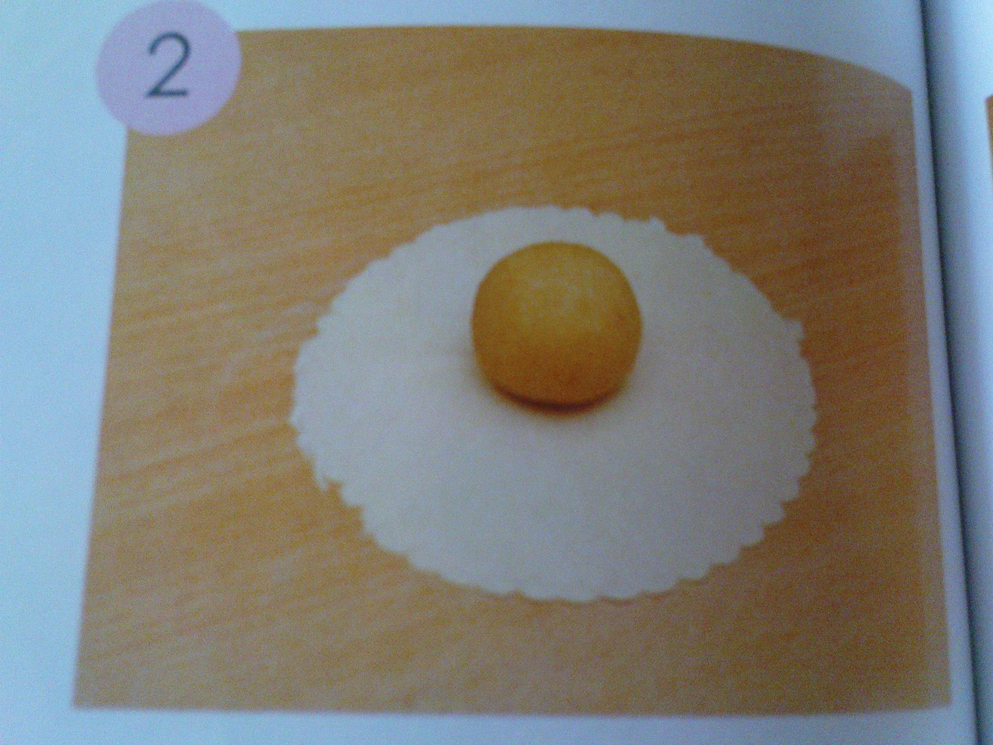 نضع وسط كل دائرة كورة حشو ثم نجمع ونقرص بعود الاسنان للحصول على طيات و نحاول الضغط في الوسط لاعطائها الشكل لي في الصورة و تزين بوريدات مصنوعة من نفس العجينة بلون بنفسجي و تثبت بباض البيض