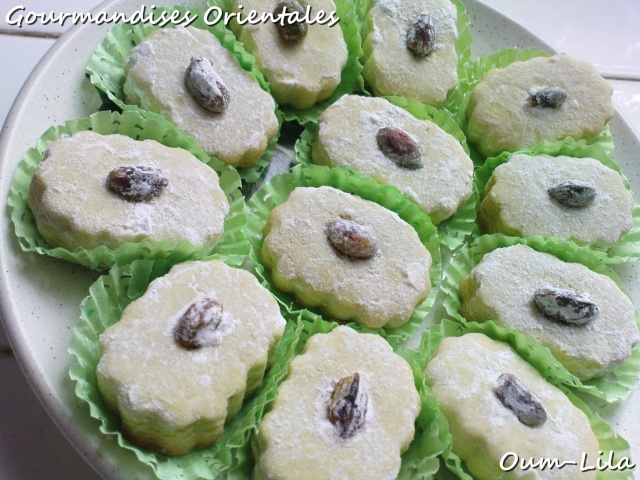 Une fois secs, placez dans des petites caissettes ou tels quels. Pour les ovales, découpez vos pièces, et placez au centre une pistache, faites cuire jusqu'a ce que le bas des gateaux est une coloration, et juste apres cuisson les rouler dans le sucre glace. Placez dans des caissettes.
