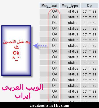 بعد عمل التحسين أو Optimize Tables راح تطلع رسالة تلاحظ جميع الجداول OK