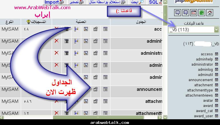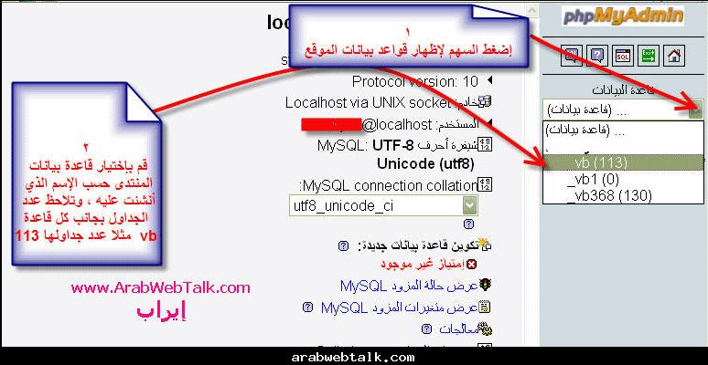 الخطوة الثالثة / الآن بعد فتح phpMyAdmin توجه للسهم ، وتختار قاعدة بيانات المنتدى حسب الإسم الذي أنشئت عليه ، مو شرط تكون vb يعني ممكن أسميها أي إسم تقدر تتأكد من ملف config في مجلد includes تبحث عن :