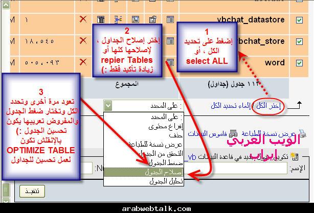 الخطوة العاشرة / بكذا نكون أصلحنا الجدول ولكن لزيادة التأكد ، تنزل تحت في أسفل الجداول بتلقى كلمة إختر الكل أو select ALL تضغط عليها لتحديد جميع الجداول ، من قائمة بجانبها على اليسار إختار " إصلاح الجداول " أو بالانقلش تكون " repier Tables " تلاحظ راح يعملك إصلاح للجداول ، ثم تكرر نفس الخطوة تحدد الكل وتختار ضغط الجداول أو تحسين الجداول بالإنقلش تكون " Optimize Tables " شاهد الصورة :