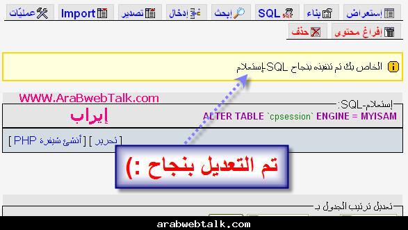 الخطوة السابعة / بعد الضغط على عمليات تنزل تحت شوي ، تلقى طلع لنا خيار " storage engine " تلاحظ النوع " HAPE " تقوم بفتح السهم بتطلع لك خيارات تختار الخيار " MyISAM " بعدها إضغط تنفيذ أو ok حسب ماهو موجود عندك باللوحة ، شاهد الصورة :