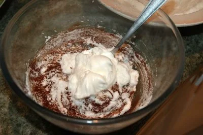 في هذه الاثناء نحضر موس الشيكولاتة الذي سنحشو به المربعات نضرب بياض البيض مع 50 غ سكر حتى يتضاعف حجمه و يصبح مثل الثلج و نتركه جانبا.نذوب 120 غ من الشيكولاتة المتبقية، ثم نزيلها من فوق النار و نضيف اليها اصفر البيضة + 60 غ من السكرالمتبقي مع التحريك جيدا ليتجانس الكل ثم نضيف للخليط بياض البيض المضرب
