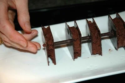 لنحضر حشوة الشانتي البيضاء التي سنضعها بين كل المربعات المحشية بموس الشيكولاتة و ذلك بخفق الشانتي الغبرة مع الحليب و السكرو كلما خفقتي أكثر كلما تماسكت الكريمة و هي أحسن. و الان بعد أن حضرنا جميع مكونات التحلية نمر لعملية المونتاجأول شيء نأخذ سكين حاد و نقطع به الشكلاطة بعد أن أصبحت جامدة و صلبة الى مربعات متساوية طول 4 سم على هذ الشكل