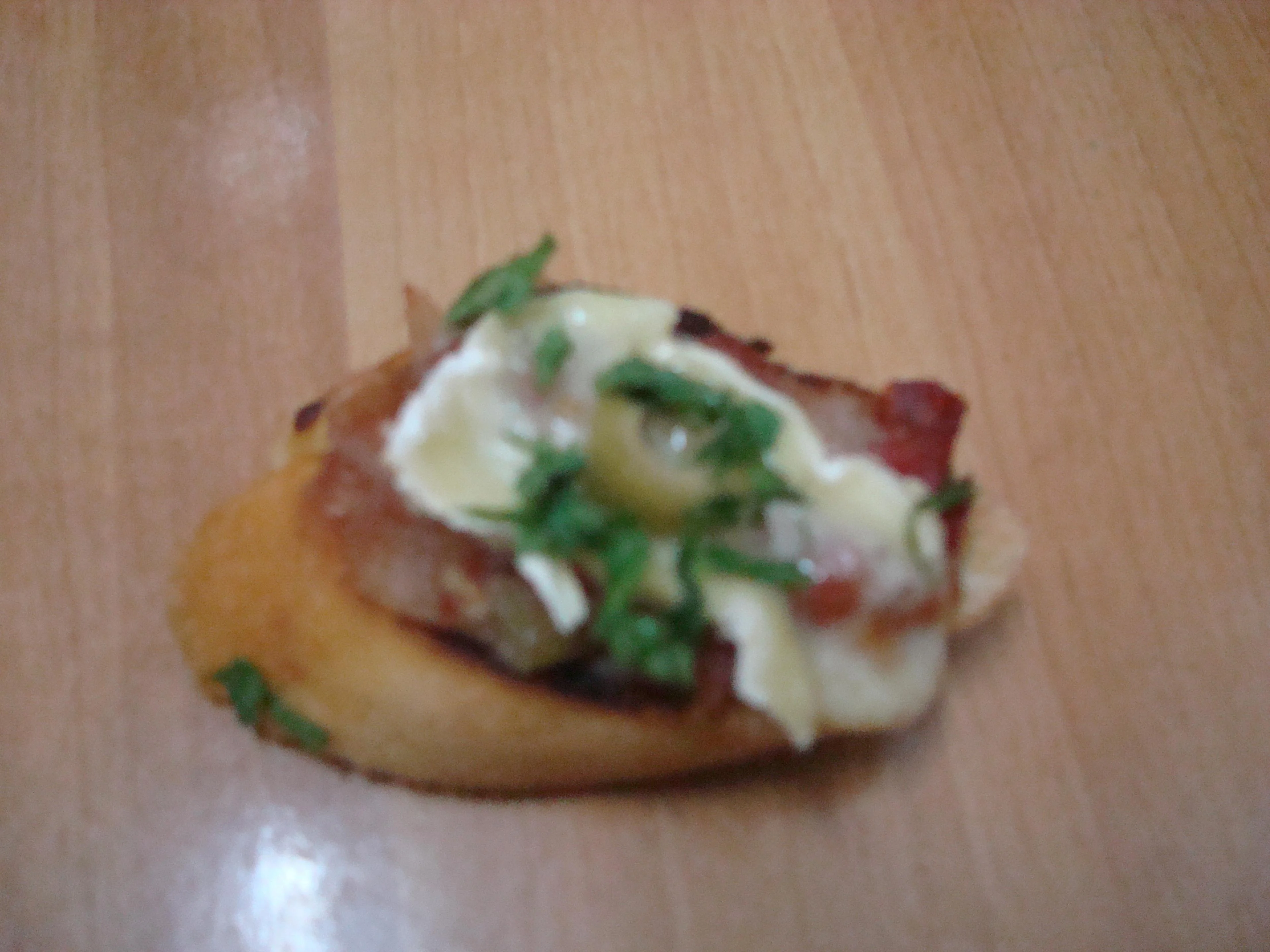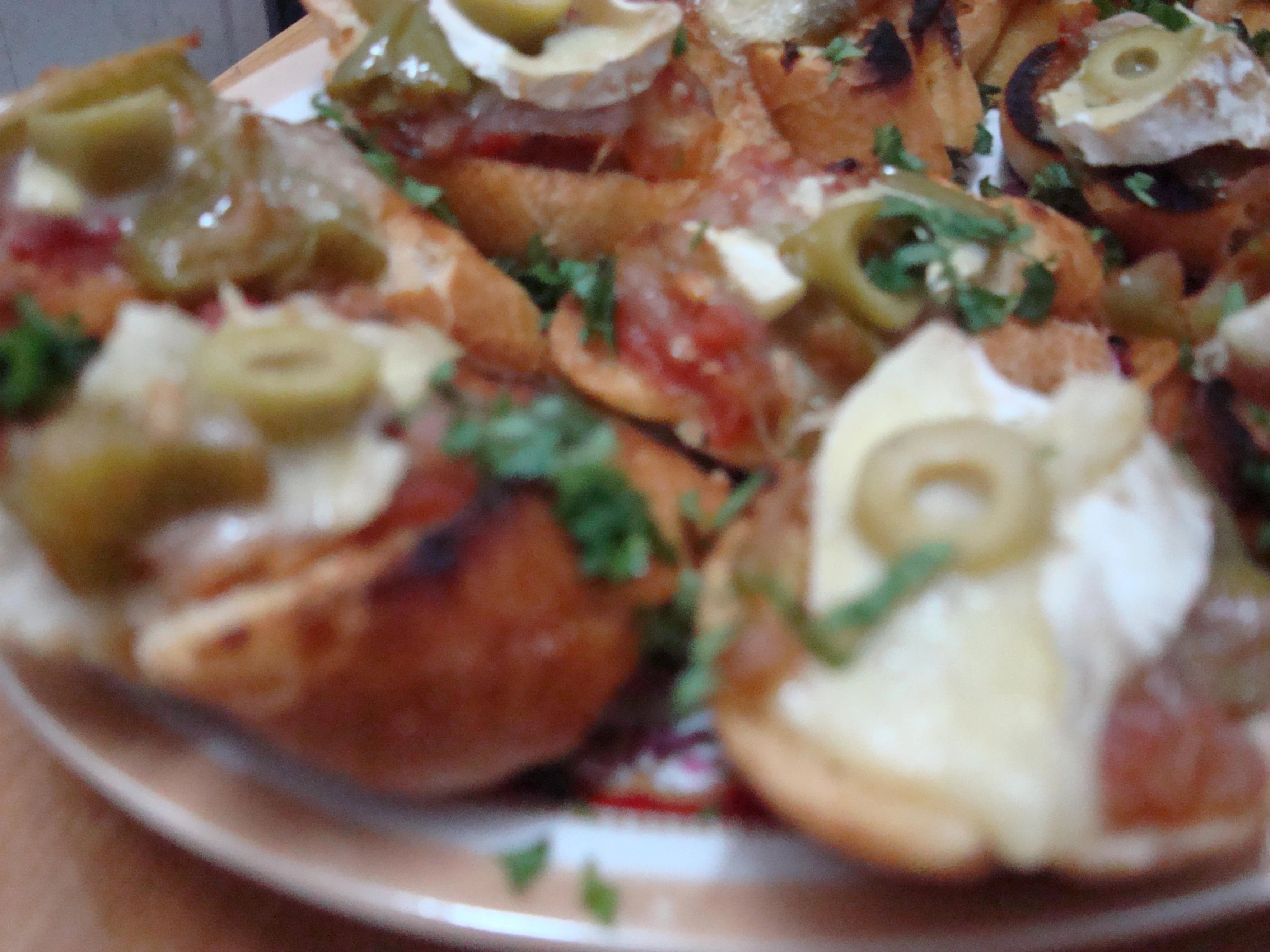 - رصي الخبز في صينية فرن ضعي على كل قطعة كومة من الحشوة ، وقطعة من جبن الكاممبير ، او الموزاريلا المبروشة أو ملعقة صغيرة من صلصة البيشاميل ، وضعي عليها نصف زيتونة