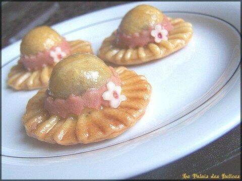 بعد ما ترتاح العجينة نحلها على سطح مرشوش بالفرينة و نشكل دوائر و نحط فوق كل دائرة حشو على شكل حرف T نسكر العجينة مليح حتى لا يتسرب الحشو و نقلبها على الجهة الاخرى و ندير القرون الثلاثة في اتجاه واحد للحصول على شكل ترافل نطهيها في الفرن لما تبرد نقلسيها بالطلاء لما تنشف ناخذ قطعة اسفنج نمسح السطح باللماع و نضع فوقها وردة عجينة اللوز بيضاء لقطعتها بواسطة طابع الوردة وفوقها دائرة من عجينة اللوز بيضاء مع ورقة في الجانب