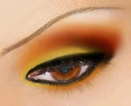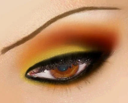 وبعدها نضع الشادو الاصفر الدهبى على الجفن المتحرك و منتصف اسفل العين بهدا الشكل كما فى الصورة