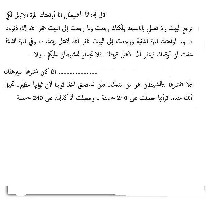 اعجبتنى قصتكي كثيرا ليما فيها من غلط لم يلحظه احد هل الشيطان يعلم الغيب ؟؟ هل شيطان يخرج للانسان ويكلمه بلسانه هل الشيطان ؟؟ يعرف اذا غفر الله لعبده ام ماذا ؟؟ كيف عرفتى بانكى حصلتى على 240حسنة وليس 300حسنة ؟؟؟ اخوانى انتبه لهذه الرسائل الخطيرة لايعلم الغيب الا الله وشيطان لايتكلم مع الانسان بل يوسوس له وسوسة لهاذا نقرء سورة الناس لنتعوذ بها من الشيطان الرجيم فحذاري من هذه الرسائل المفخخة