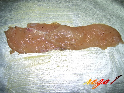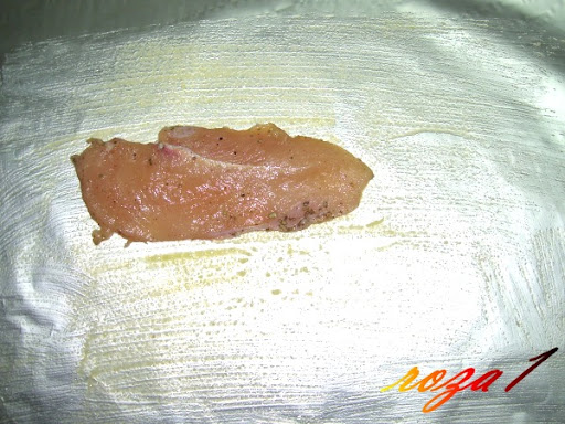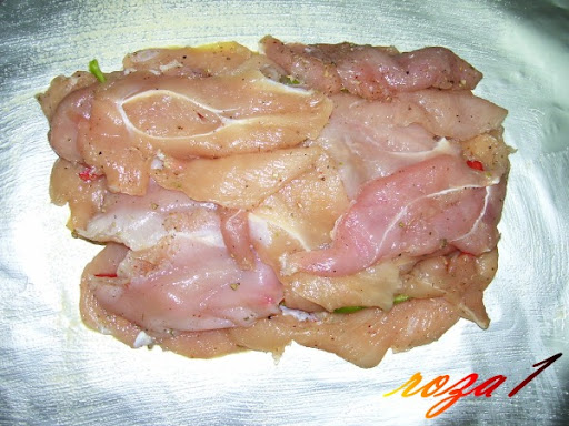 نصف شرائح الدجاج فوق الورق الألمنيوم