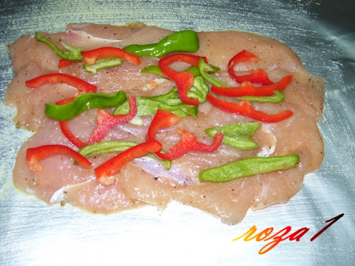 ثم نضع الفلفل الحلو ثم باقي شرائح الدجاج