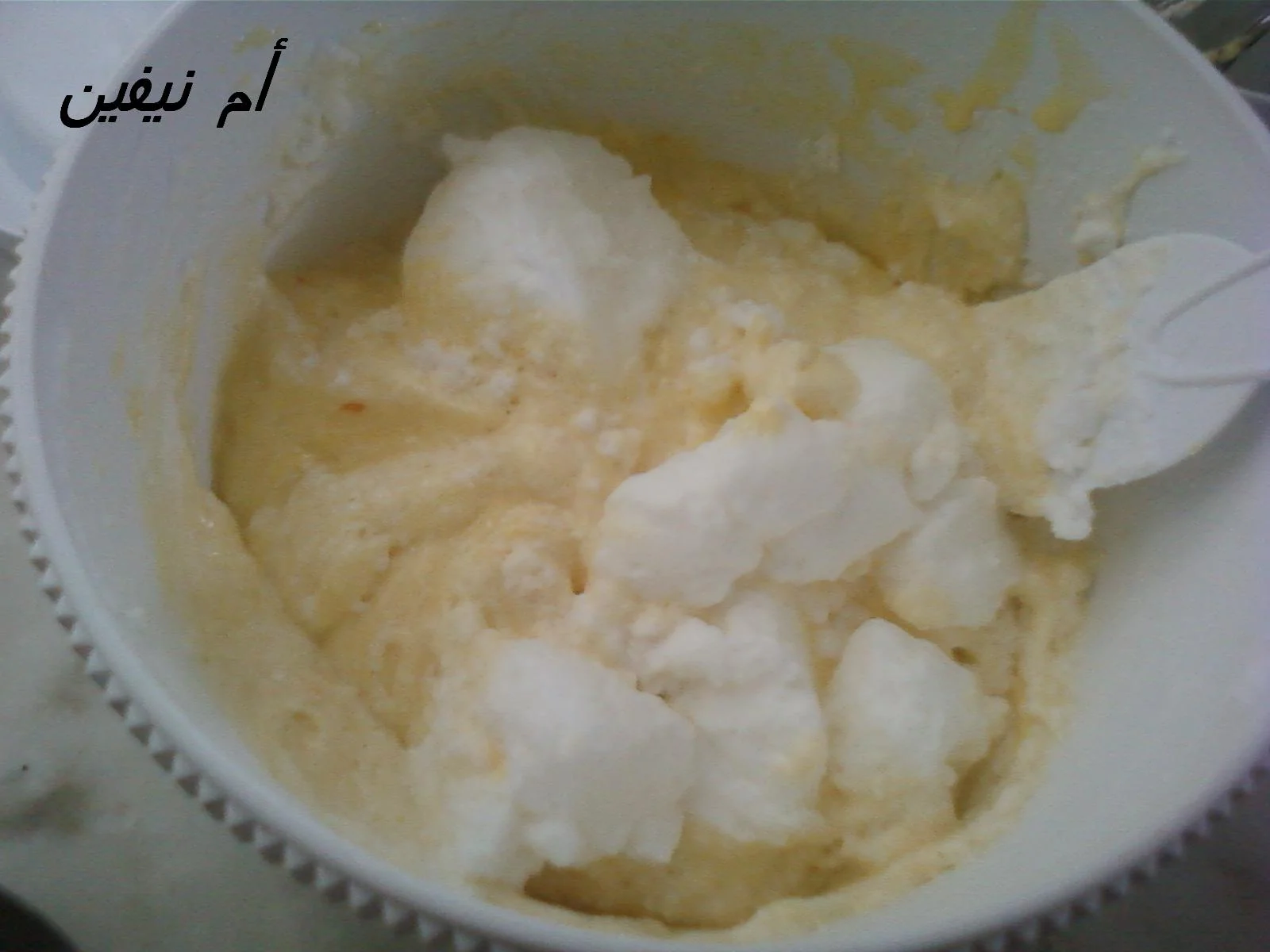 * 4 بياض بيض+رفعة صغيرة ملح+نصف مكيال سكر عادي=كالثلج و يترك جانبا