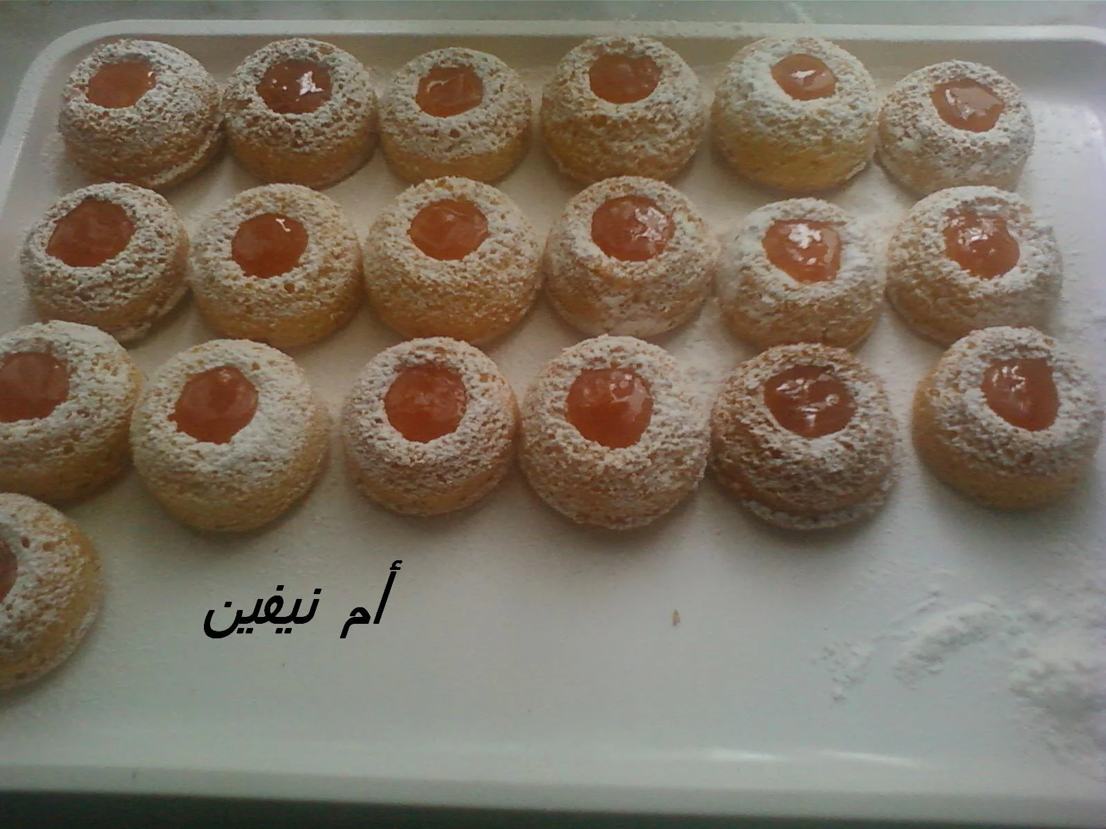* أخيرا نذري من فوق سكر قلاسي و نضع كمية صغيرة من المربى (أنا استعملت مربى المشمش المنزلي)