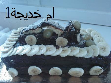 وهذه نفس المقادير وتتعمل في 2 بلاط مستطيل وتتعمل كرام فراش مخفوقة بين الطبقتين وانا عملت شرائح موز ولوز ايفلي ونوات كوكو للتزيين بعد ماسيحت الشيكولاطة عليها
