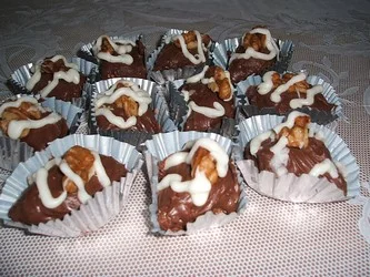 بعد اخراجها من المبرد تغطس في الشكلاط السوداء (نيوتلا)، وبعد قليل تزين بخطوط من الشوكولا الأبيض . ثم حبة جوز