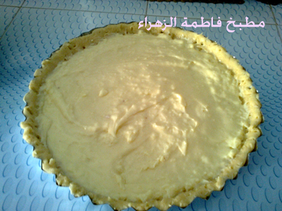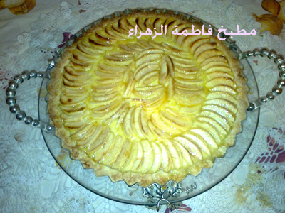 ونسكبه فوق عجينة ونزين بتفاح ونرشه بقليل من السكر وندخلها الى الفرن