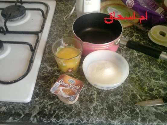 في هذه الاثناء نحظر السيرو ..3ارباع كاس عصير البرتقال +100غ سكر عادي ..نتركه يغلى لمدة 5 دقائق و يبرد قليلا ثم نضيف له علبة كريم ديسار كارامال