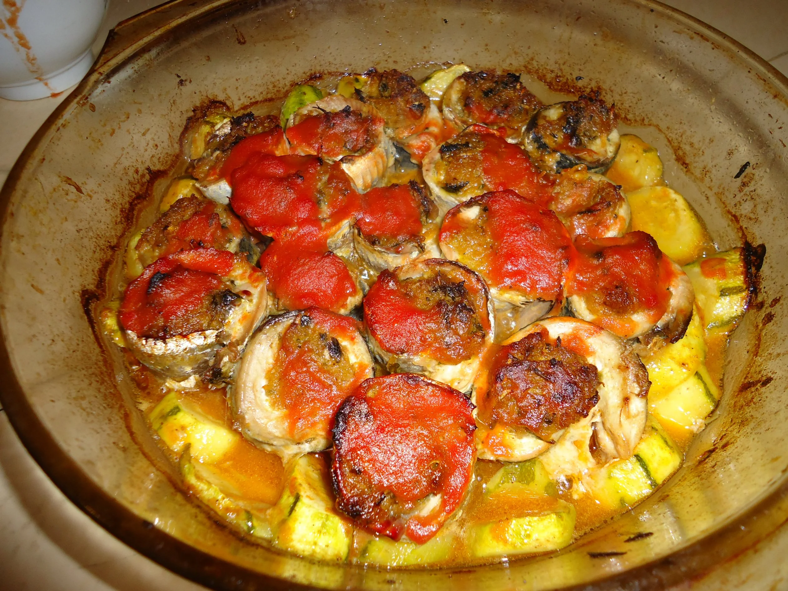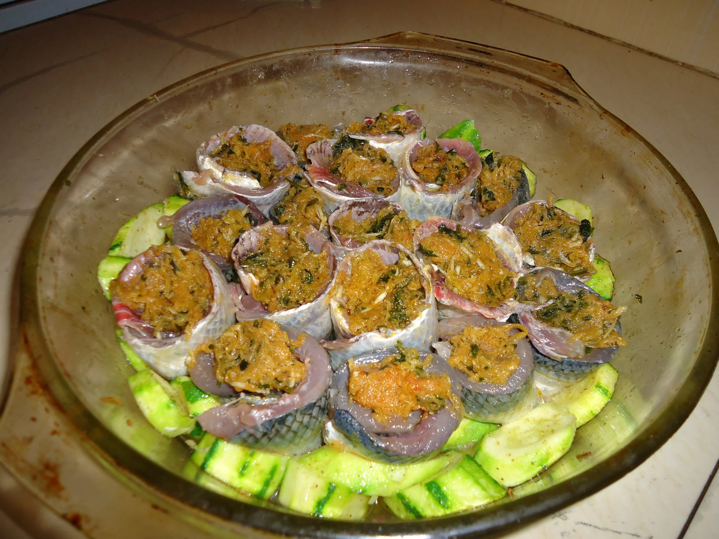 بعدمانظفت الحوت قسمو على اثنين وعمرتو بخلطة من الجزر منجور اي خيوط مع التومة والزيت الملح والحشيش القسبر والكرافس ورتبتو بالبلا فيه طبقة من الكورجات مدهونة الزيت والملح ولبزار وعملتو بالفور