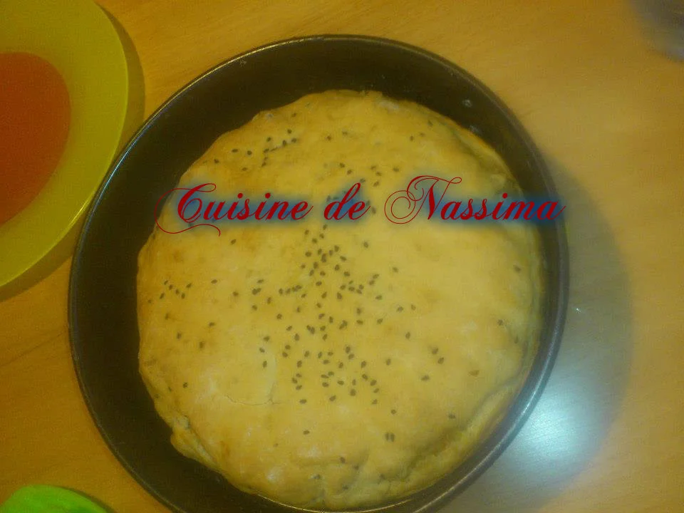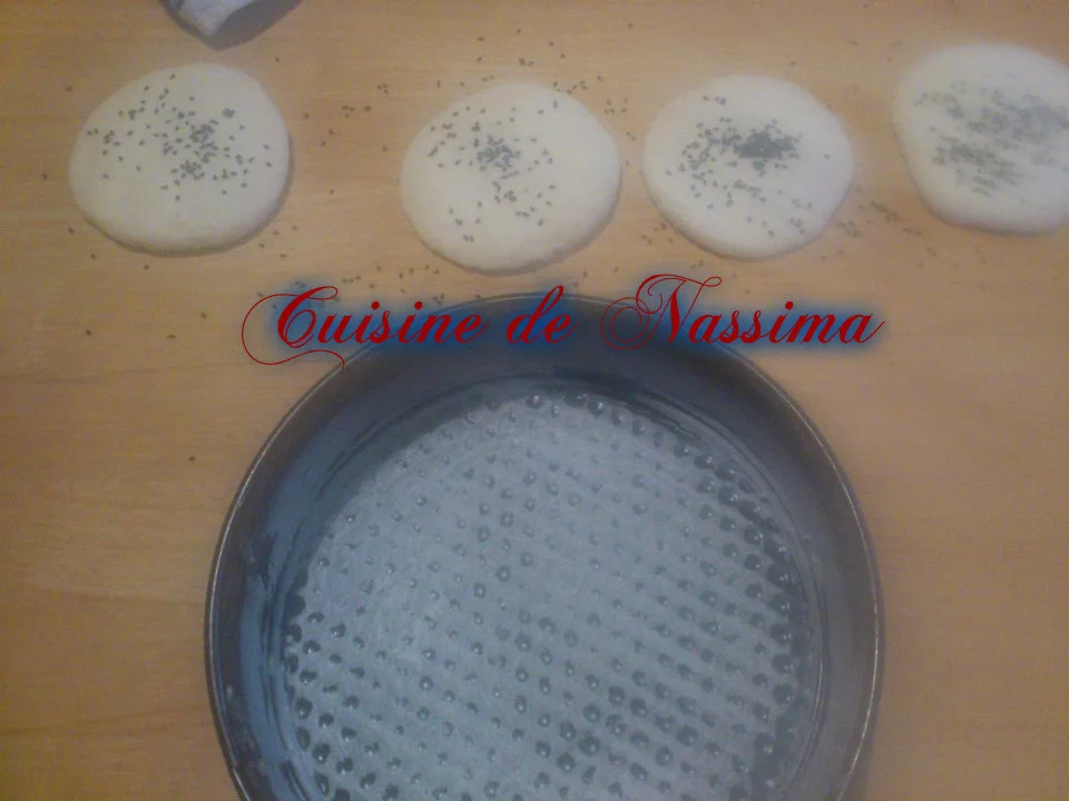 * -يُخلط الدقيق مع الملح، الخميرة والسكر في العجان الكهربائي على سرعة بطيئة. -يُضاف الزيت والماء الدافىء تدريجياً وتُعجن المكونات على سرعة متوسطة حتى تتداخل ونحصل على عجين أملس ناعم لا يلتصق بوعاء العجان. -يُغطى العجين ويُترك في مكان دافىء لحوالي 35 دقيقة أو حتى يختمر ويتضاعف حجمه. -يُسخن الفرن على درجة حرارة 180 مئوية، يُدهن قالب فرن دائري بالقليل من الزيت. -يُرش العجين بالحبة السوداء ويُمد باليد على سطح أملس مرشوش بالدقيق. -يُقسم إلى أربعة أجزاء متساوية الحجم، يُمد كل جزء على هيئة دائرة بنفس مقاس القالب المُعد (يُراعى تغطية العجين لحين الاستخدام حتى لا يجف