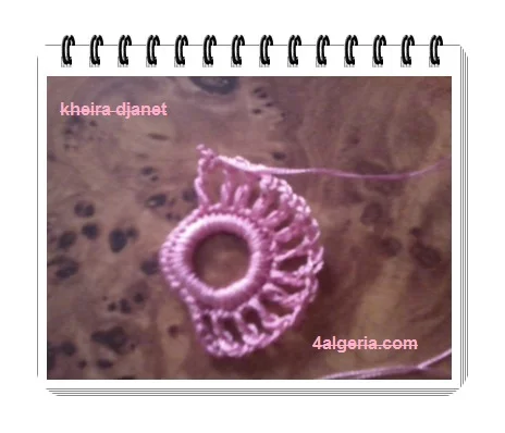 عملت 6 عيون وغلقت السلسلة ثم طلعت ب2 عيون وعملت نصف عمود 14 وغلقت ثم عملت 3 عيون كسلسال باه نطلع وعملت 4 اعمدة في نفس العين يصيرو 5 فهمتي ثم ميلت الشغل وبقيت ندخل الخيط بين الاعمدة الخمسة ونسحب ونرخي قليلا ونا نعمل زرة لما اسحب وهي تبقى تنزل حتى التحت أي 6 مرات وانا نسحب الخيط بين الاعمدة باللف عليهم وفي نفس العين الي طلعنا منها بسنسال من 3 عيون نغلق وننتقل للعين الى بجانبها ونعمل كما في السابق حتى نشكل اوراق