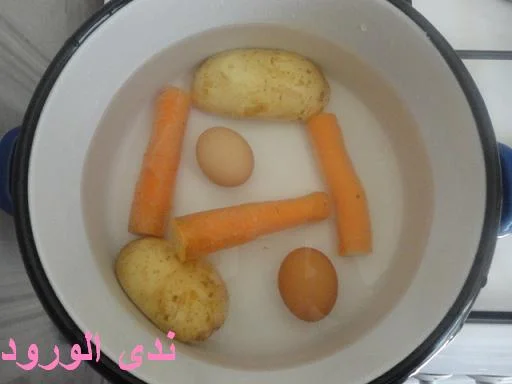 في طنجرة نضع البطاطا والجزر الغير مقشر والبيضتين ونضعها على النار