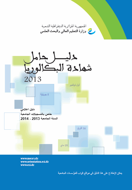 إن اختيار هذا التكوين يجب أن يستجيب لمتطلبات المهنة التي تطمح إليها وهي مرتبطة أيضا بمواهبك وقدراتك. لهذا فأنت مدعو للقيام بالاختيار الصائب من ضمن التكوينات المتعددة والمتنوعة التي تعرضها مؤسسات قطاع التعليم العالي والبحث العلمي ، على الناجحين في بكالوريا 2013، وأنت أحدهم وبكل استحقاق.