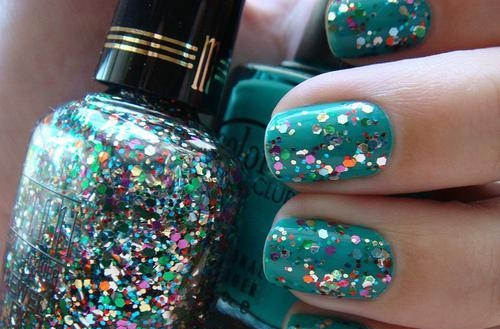 مانيكير مختلف جدا بدرجة الأخضر الجميل , يمكنك عمله بسهولة قومى بوضع طبقة من المانيكير وانتظرى حتى يجف ثم قومى بوضع طبقة من مانيكير الجليتر ووزعيه على حسب ذوقك , طلة جميلة مناسبة للسهرات وهذا اللون يناسب البشرة الخمرية والبيضاء .