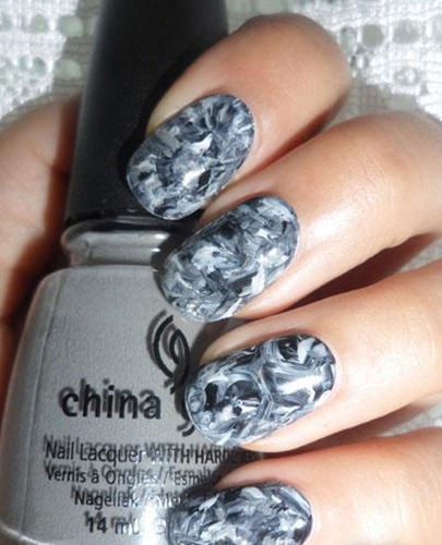 هذه النقشة غريبة ومختلفة جدا , استخدم فيها لونى الأبيض والرمادى وبامكانك عمل هذه النقشة بكل سهولة , قومى بوضع طبقة أولى من المانيكير الأبيض ثم الرمادى واحضرى اسفنجة صغيرة واعملى نقوشات بلمسات خفيفة عشوائية .