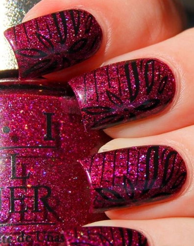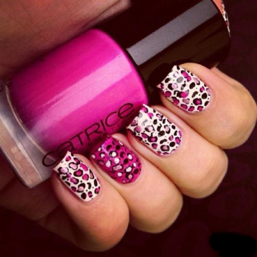 هذه النقشة استخدم فيها ألوان الوردى والأبيض والأسود ووزعت النقوشات بشكل جميل وميز ظفر واحد باستبدال الألوان فجعل من المانيكير شكلا أروع .