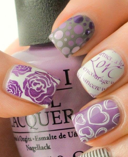 مانيكير مميز جدا بنقوشات مميزة لكل ظفر نقشة منفردة ورائعة استخدم اللون الأرجوانى والأبيض ولعب باللونين ليظهر جمالا مافى مثله وروعة وشياكة ,
