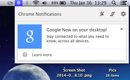 وإن أردت إيقاف خدمة Google Now على كروم اضغط على أيقونة الجرس في شريط المهام على ويندوز أو ماك لفتح مركز التنبيهات، وبعدها اضغط على رمز المسنن في الزاوية اليمنى السفلية على ويندوز و قم بإزالة الإشارة عن Google Now.
