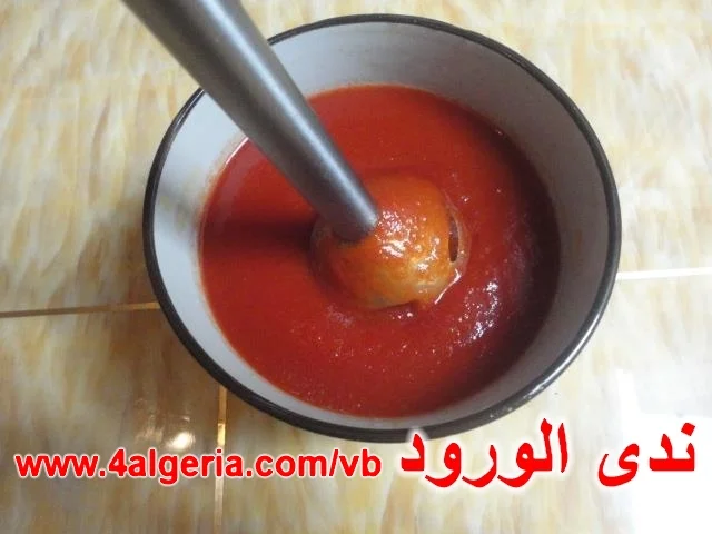 اولا نغسل الطماطم جيدا نقطعها إلى قطع ونهرسها جيدا في الخلاط الكهربائي