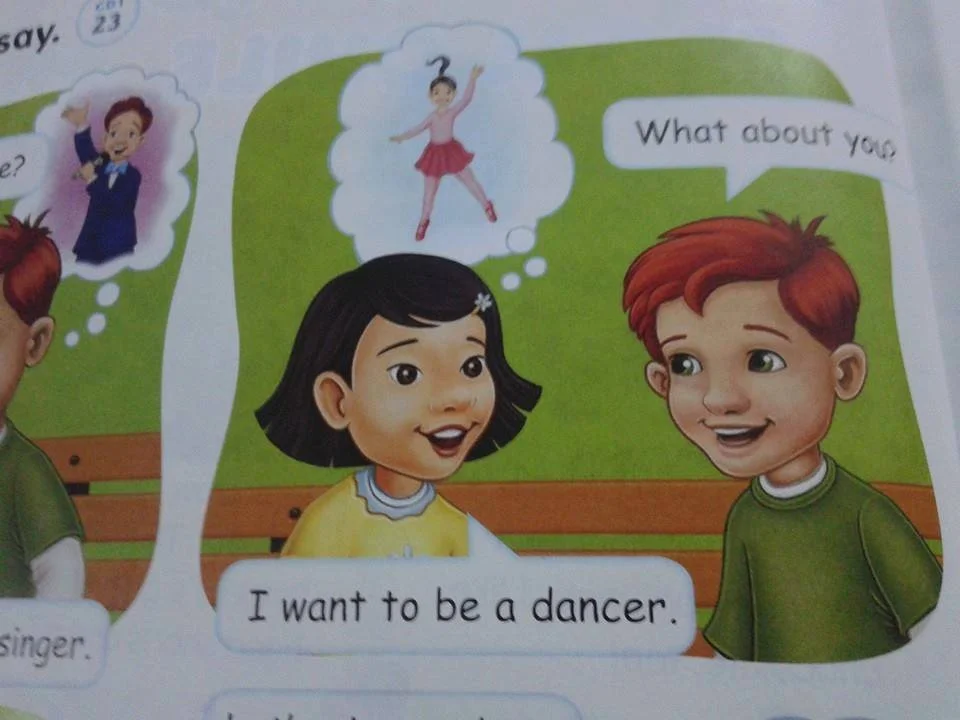 من أحد كتب " التعليم " للصف الرابع الابتدائي بأحد " بلاد / دول الإسلام " : الأخ يسأل أخته عن " أملها " الذي تتمناه مستقبلاً ، فتقول له إنها تتمنى أن تصبح " راقصة " !!! .